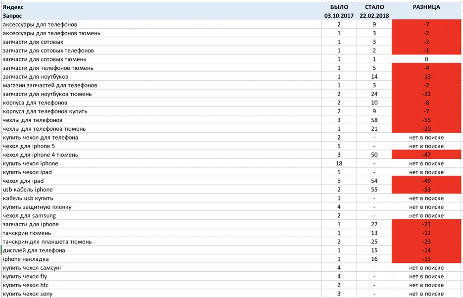 В результате ухудшились все позиции по сайту, часть запросов «вылетела» из поиска, трафик упал более чем в 2 раза.