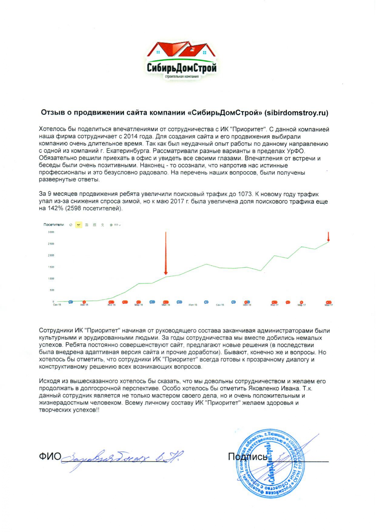 "Наконец - то осознали, что напротив нас истинные профессионалы и это безусловно радовало. За 9 месяцев продвижения ребята увеличили поисковый трафик до 1073. Сотрудники ИК "Приоритет" начиная от руководящего состава заканчивая администраторами были культурными и эрудированными людьми. За годы сотрудничества мы вместе добились немалых успехов."